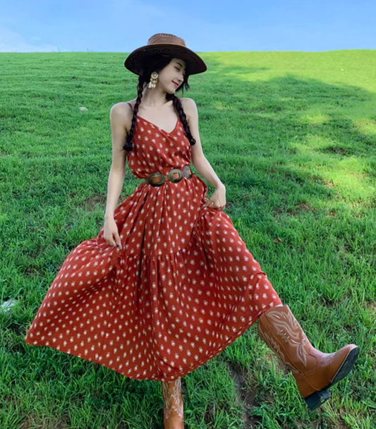 Beach holiday dress travel wear chiffon retro red dress floral loose suspender beach dress R1599