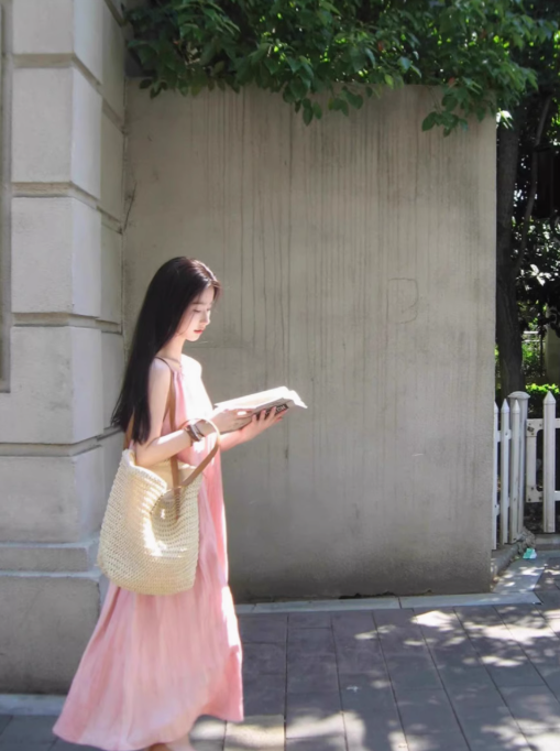 Sexy drawstring suspender dress gentle loose gradient pink niche design long skirt R1547