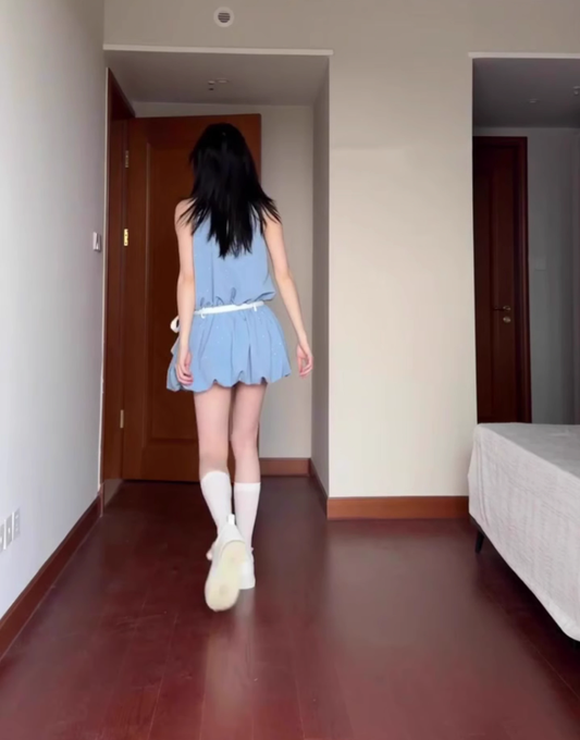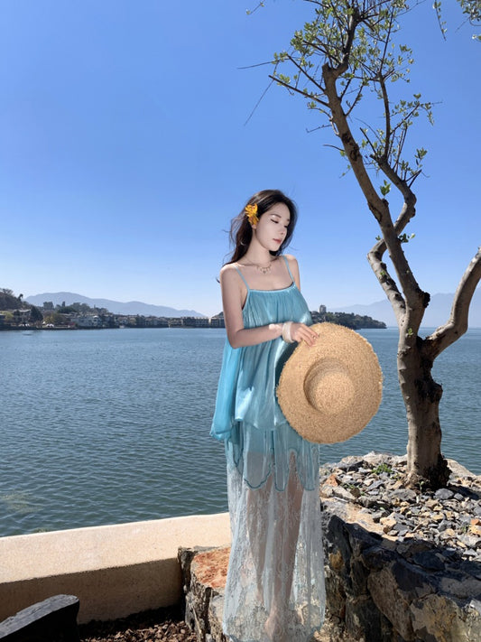 Holiday style gentle temperament unique beautiful blue suspender top skirt two-piece set R0869