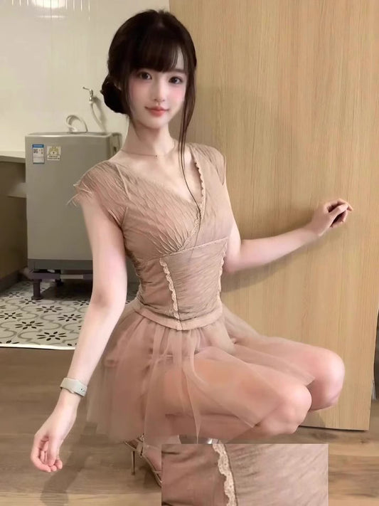 Gentle temperament v-neck sleeveless top mesh skirt beautiful two-piece suit R0870