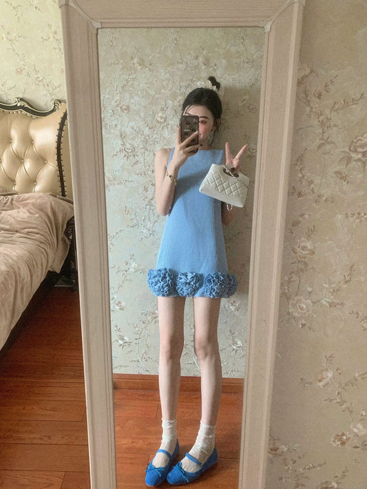 French style blue Chanel style vest dress beautiful loose A-line short skirt R0868