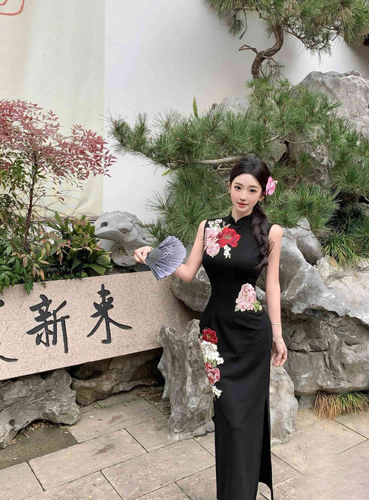 New Chinese retro stand collar dress with beautiful temperament and floral slim long skirt R0877