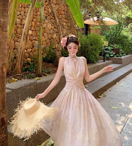 Gentle temperament v-neck jacquard halter dress holiday style beautiful dress R0871