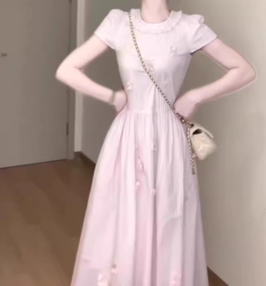 Gentle style pink baby collar dress floral waist A-line long skirt R0790