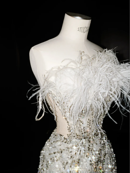 White tube top feather waist slim sequin fishtail maxi dress, prom dress R5662