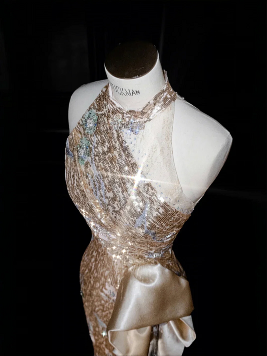 Rose gold sequined halter neck slim waist sexy long skirt, prom dress R5670