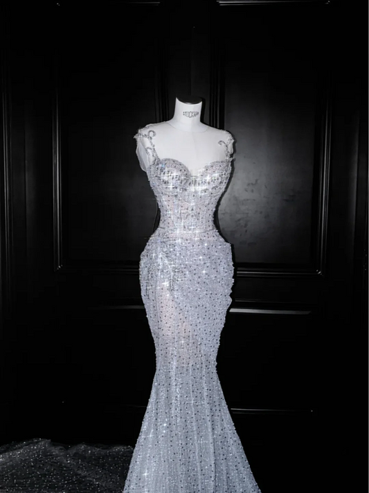 White suspender sequined waist slim hip fishtail long skirt, prom dress R5669