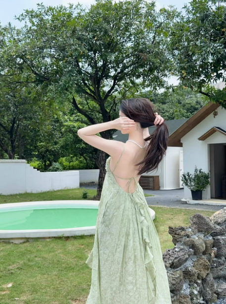 French style green v-neck suspender dress seaside holiday pure sexy backless long dress R0241