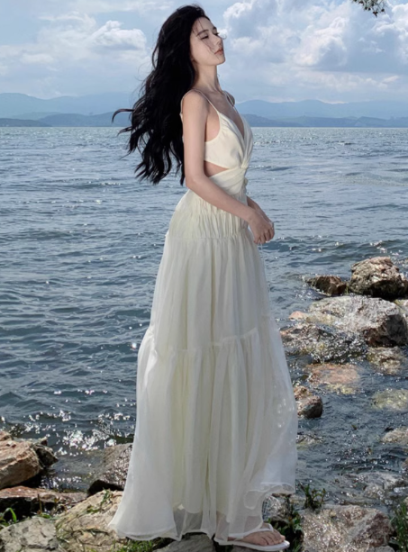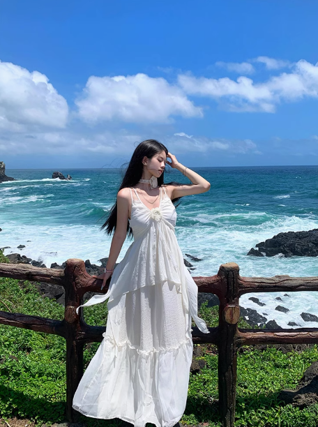 French style white suspender dress seaside holiday atmosphere long dress R0242