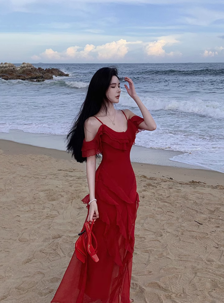 French retro beautiful red suspender dress ruffled seaside holiday dress R0230