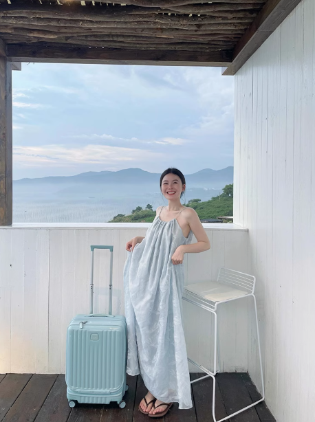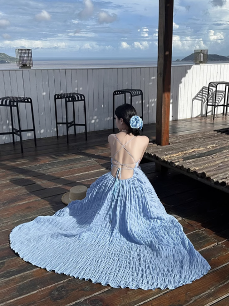 French pleated backless blue suspender dress temperament loose seaside holiday long skirt R0240