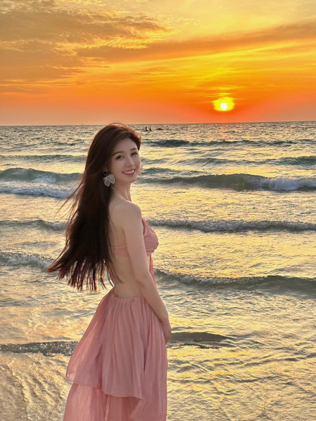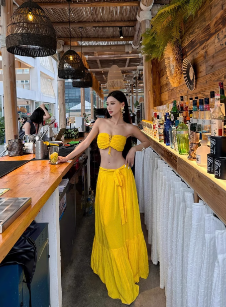 Sexy hottie on vacation at the seaside wears a full set of dopamine waist-baring two-piece suit R0234