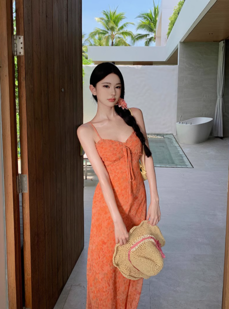 French chiffon floral dress waist-hugging white orange suspender dress seaside holiday long dress R0239