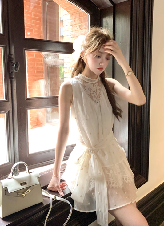 Mid-length chiffon waist-hugging sling neckline A-line dress summer French style slim temperament skirt R4737