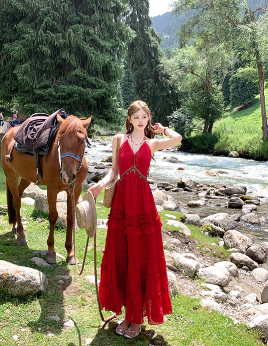 Red mid-length hollow loose suspender dress mesh skirt summer French holiday style skirt R4577