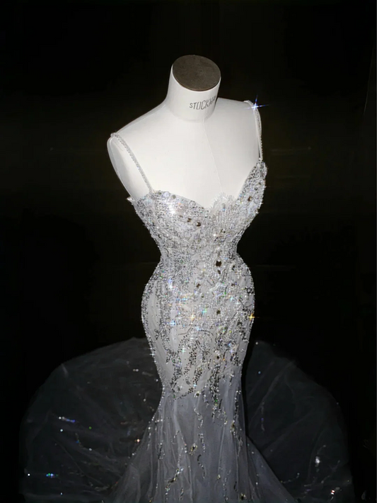White suspender sequined diamond waist slim hip long skirt, prom dress R5632