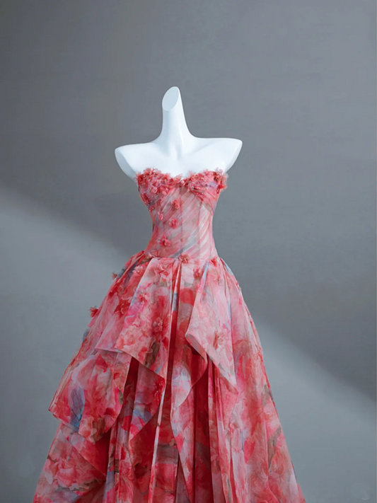 Pink floral tube top waist A-line long skirt, prom dress R5636