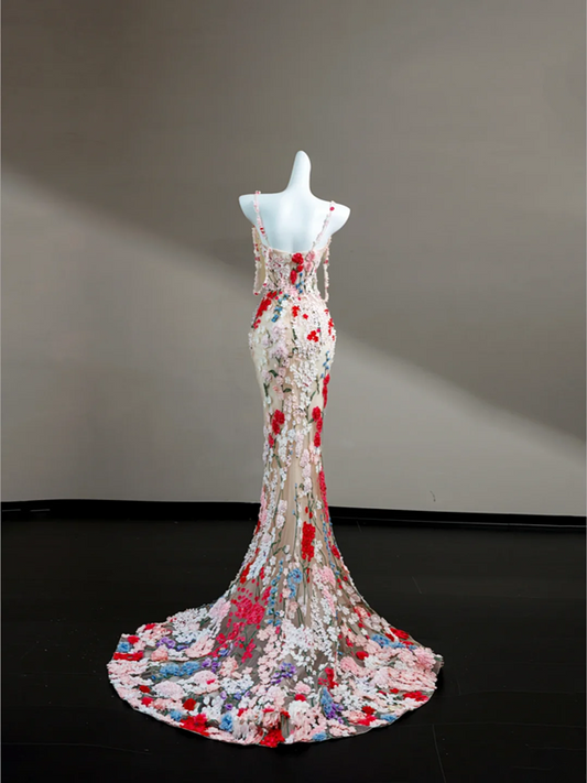 Pink suspenders and white flowers slim hip skirt, prom dress R5634