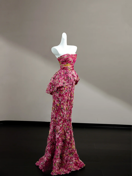 Pink floral tube top sexy long skirt with waist, prom dress R5641