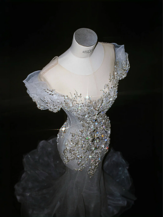 Light blue one-shoulder diamond waist-hugging hip-wrapped fishtail sexy long skirt, prom dress R5643