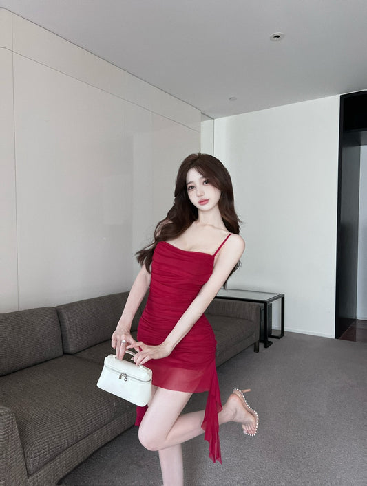 French sexy suspender dress summer slim fit ruffled hip short vest dress R3748