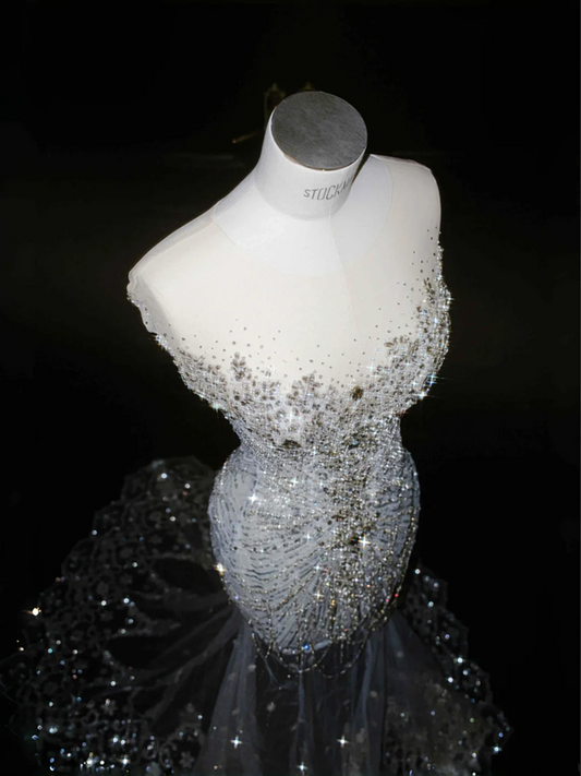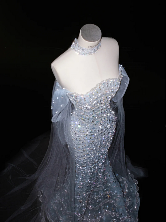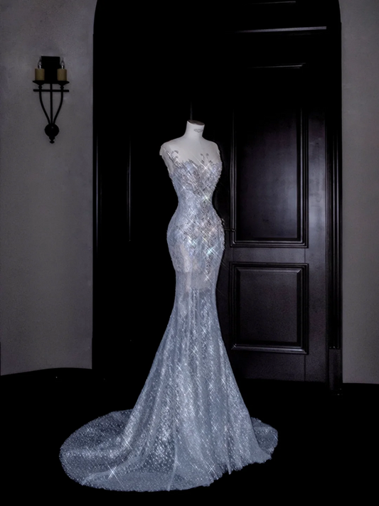 Light blue sequined one-shoulder waist-hugging hip-wrapped fishtail sexy long skirt, prom dress R5616