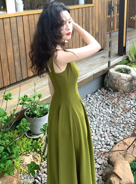 Retro red suspender dress with elegant waist and square neck, gentle A-line long skirt R1431