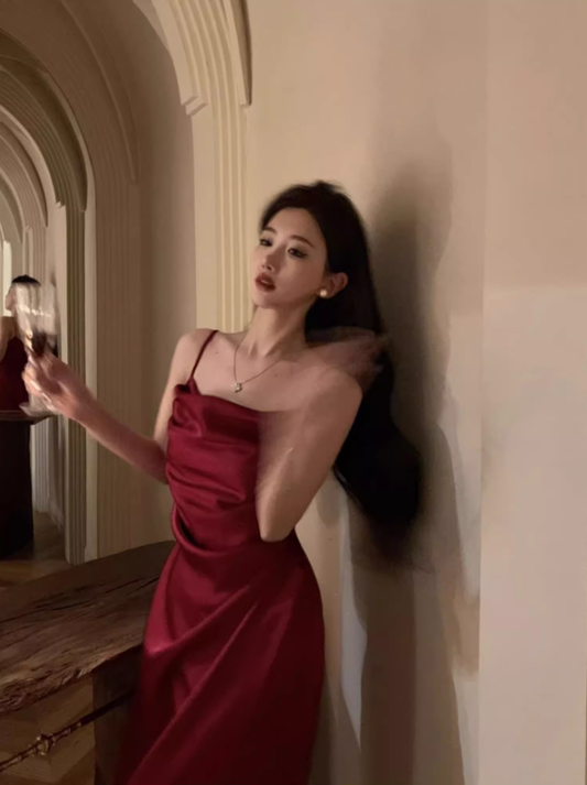 Burgundy Temperament Pleated Suspender Dress Satin Slim Irregular Inner Skirt R1428