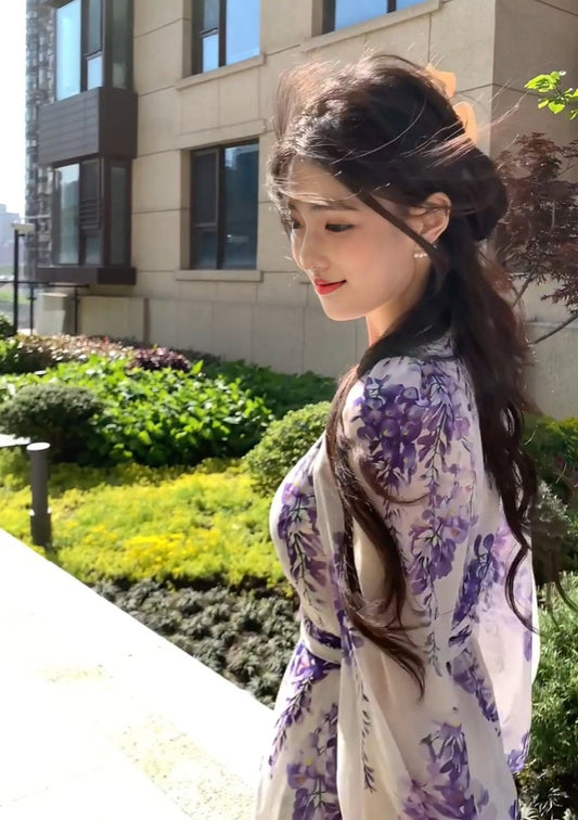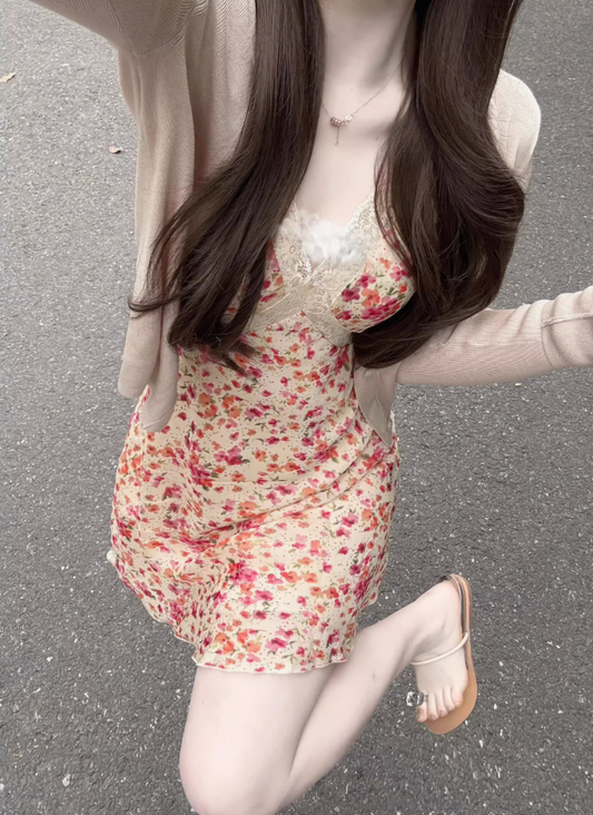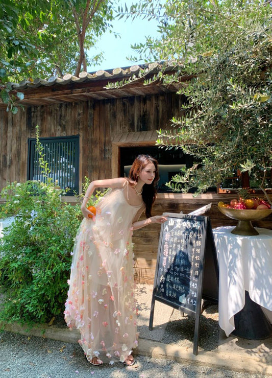 Yellow gradient floral suspender dress with gentle temperament and slim waist R0681