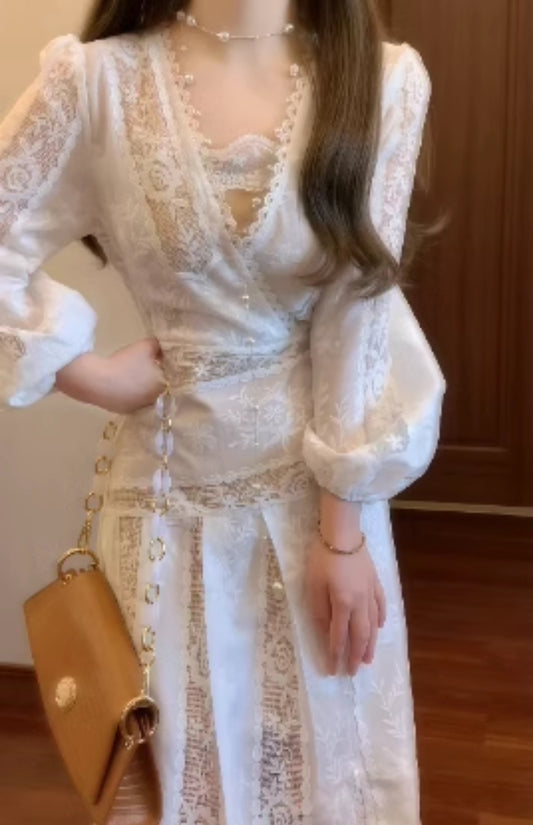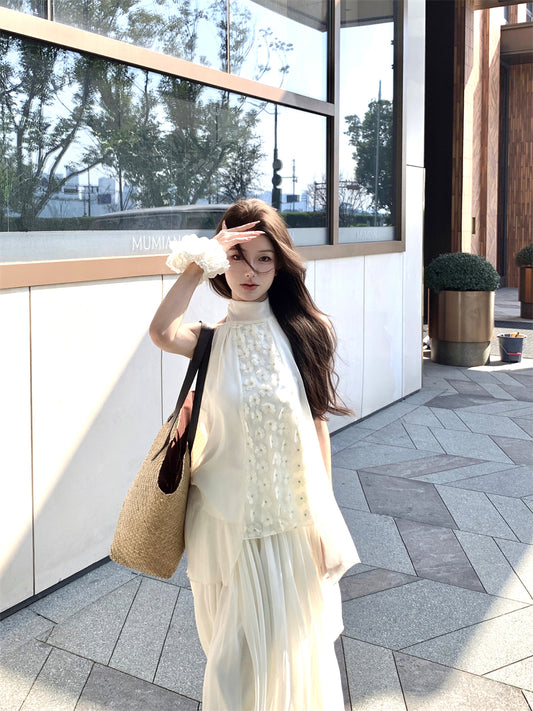 Beautiful suit outfit first love white floral halter neck top skirt two piece skirt R0689