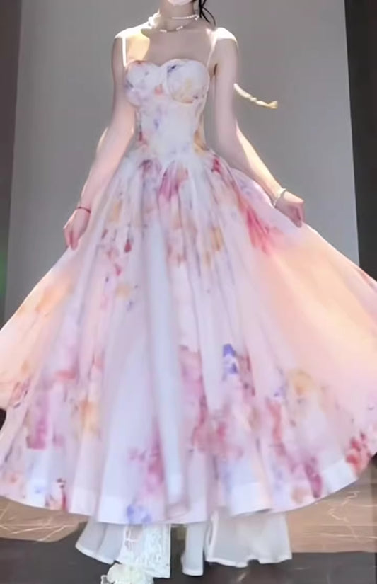 Gentle floral suspender dress holiday style beautiful waist A-line long skirt R0688