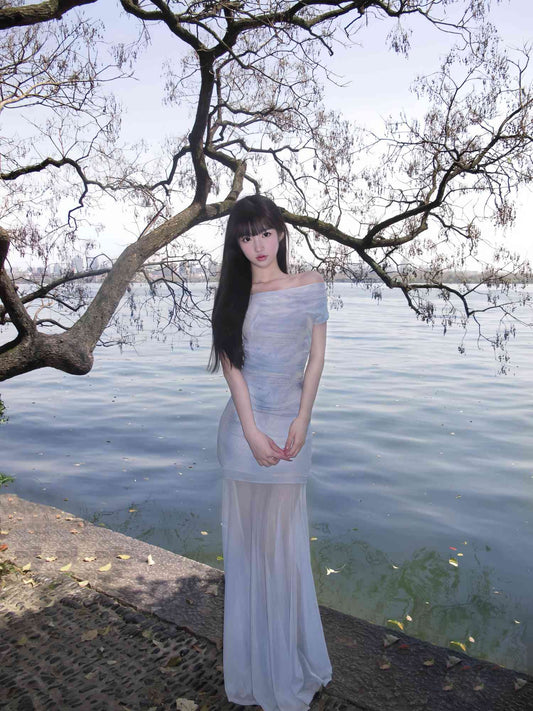 Blue floral one-shoulder dress, gentle temperament, beautiful waist and hip skirt R0686