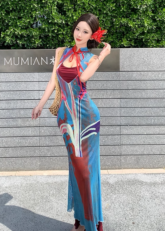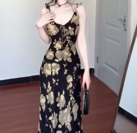 Retro printed suspender dress gentle temperament A-line long skirt R0660