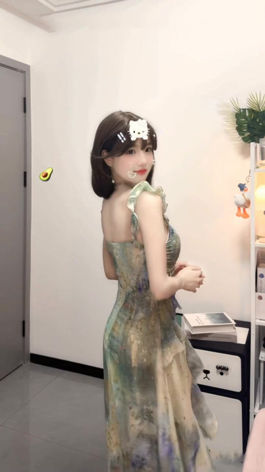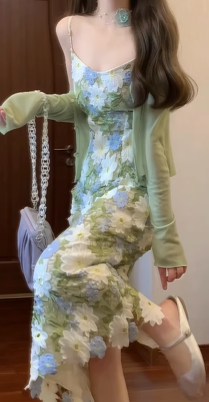 Gentle green floral suspender dress with beautiful temperament waist long skirt R0654