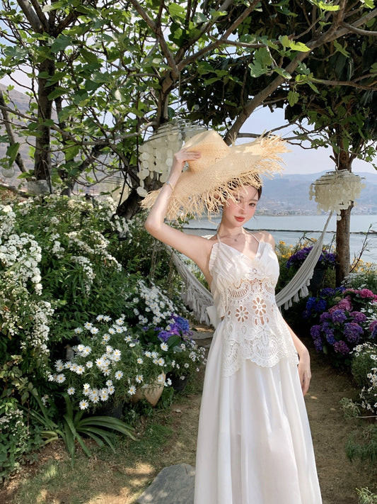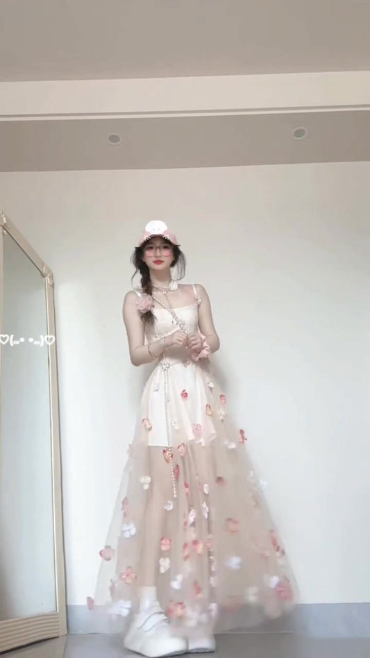 Flower suspender dress gentle temperament beautiful waist A-line long skirt R0661
