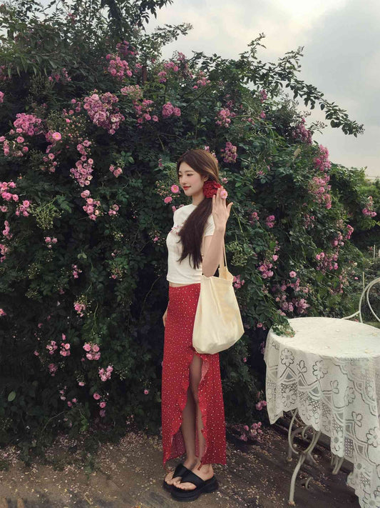 Wear a white short-sleeved T-shirt and floral skirt, a beautiful two-piece suit R0655