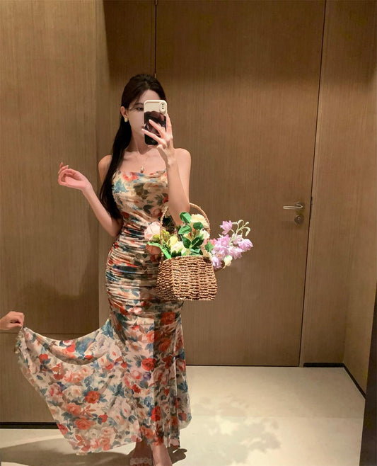 Retro floral suspender dress gentle temperament waist slim hip skirt R0649