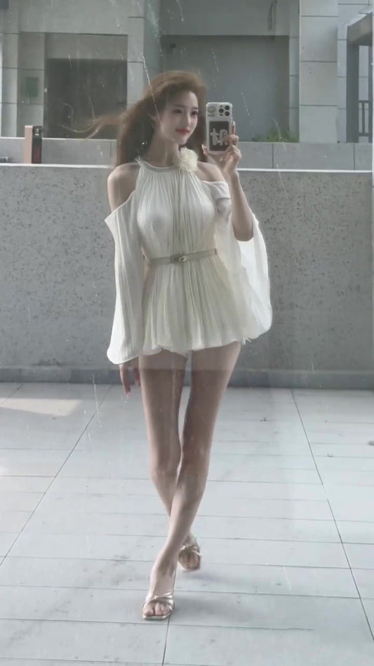 Temperament three-dimensional flower halter neck dress beautiful waist A-line short skirt R0653