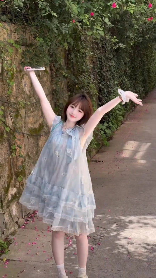 Gentle and sweet style blue floral dress beautiful loose A-line short skirt for petite R0651