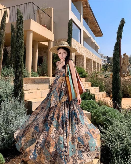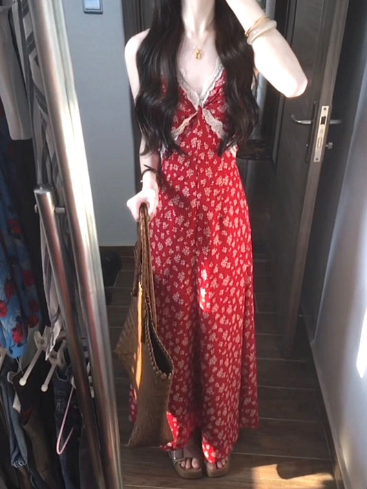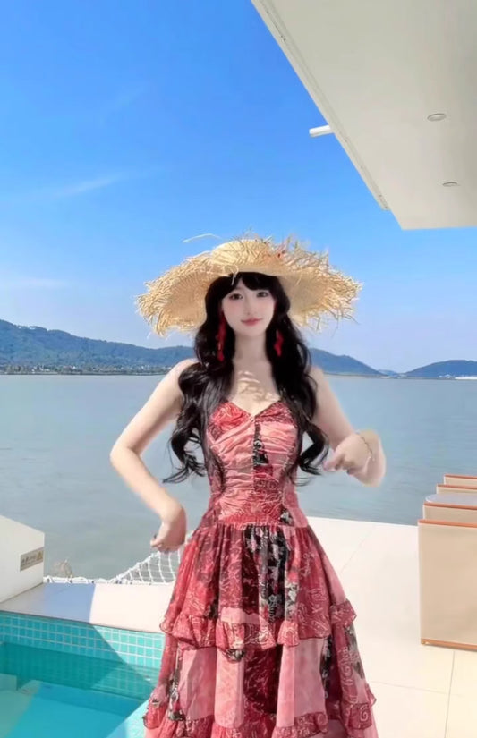 Retro floral suspender dress, beautiful temperament beach dress R0602