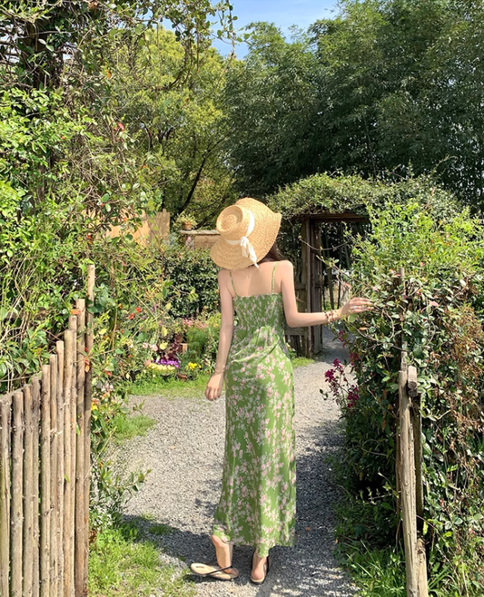 Green floral suspender dress beautiful waist A-line long skirt R0601