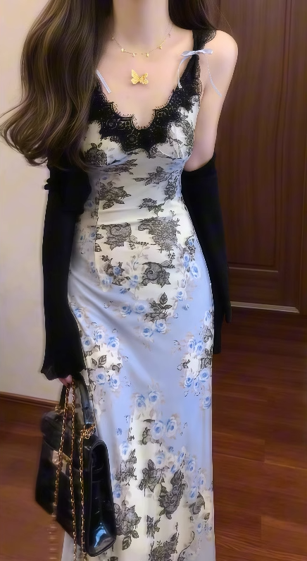Women's French V-neck floral suspender dress waist and hip long skirt R0611
