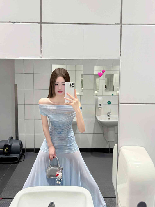 Blue floral mesh one-shoulder dress with gentle temperament and beautiful waist R0608