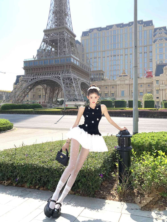Black sleeveless vest dress with unique temperament and waist A-line puffy skirt R0556