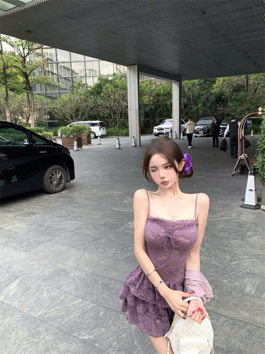 Sexy purple suspender dress with elegant waist and slimming A-line short skirt R0541