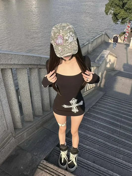 Printed long-sleeved black dress 2025 new slim hip skirt short style R0551