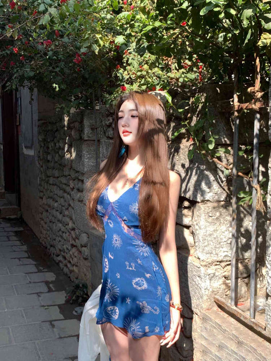 V-neck blue floral suspender dress shows figure and waist A-line short skirt R0522