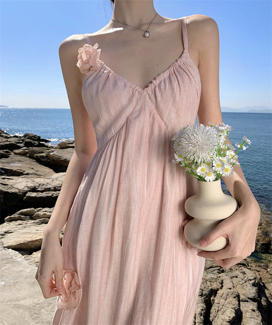 Pink flower suspender dress beautiful small skirt temperament long skirt R0521