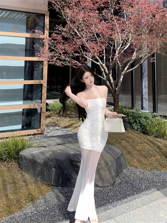 Green suspender dress, elegant waist, slim fit, hip skirt R0535