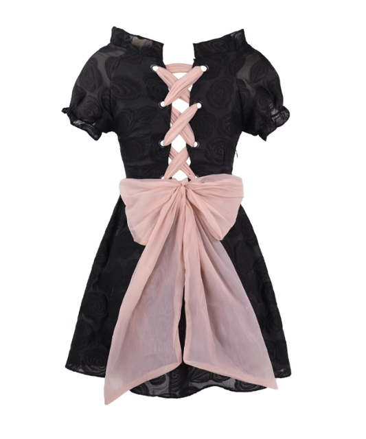 Dark night elf design lace-up back bow dress for women with slim waist A-line short skirt R0091